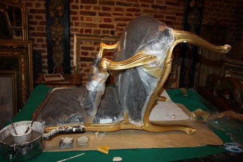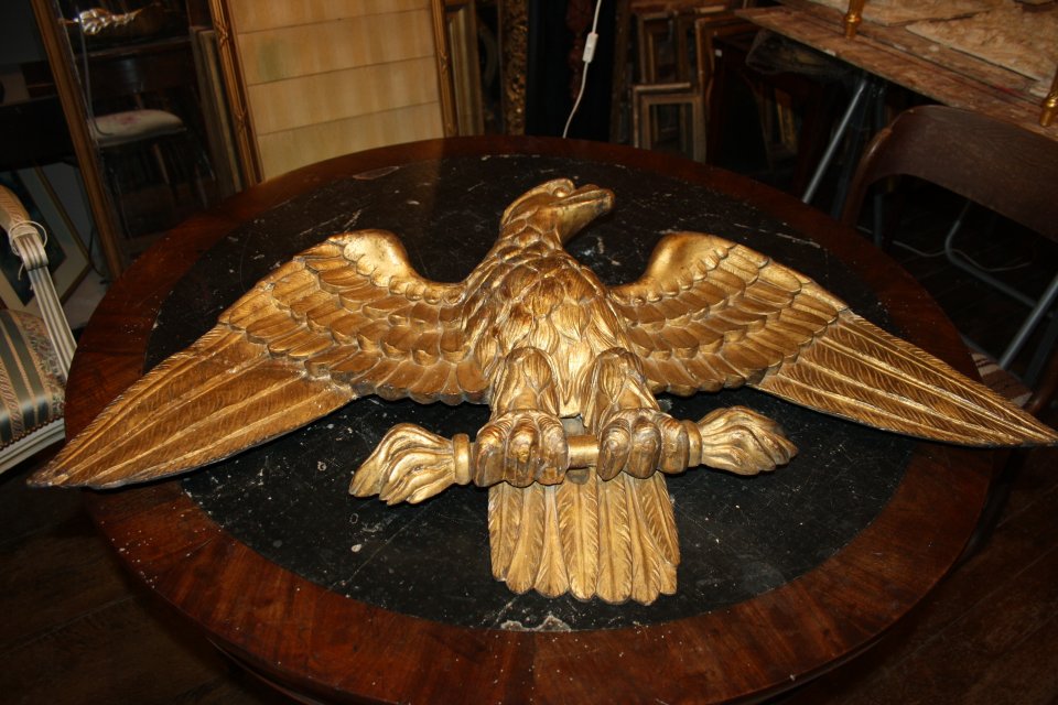 Aigle en bois doré, cassé lors d'une chute. Refixation des éléments disjoints, reprise des nombreux éclats dans la dorure. Patine des restaurations s'intégrant dans la dorure d'origine.