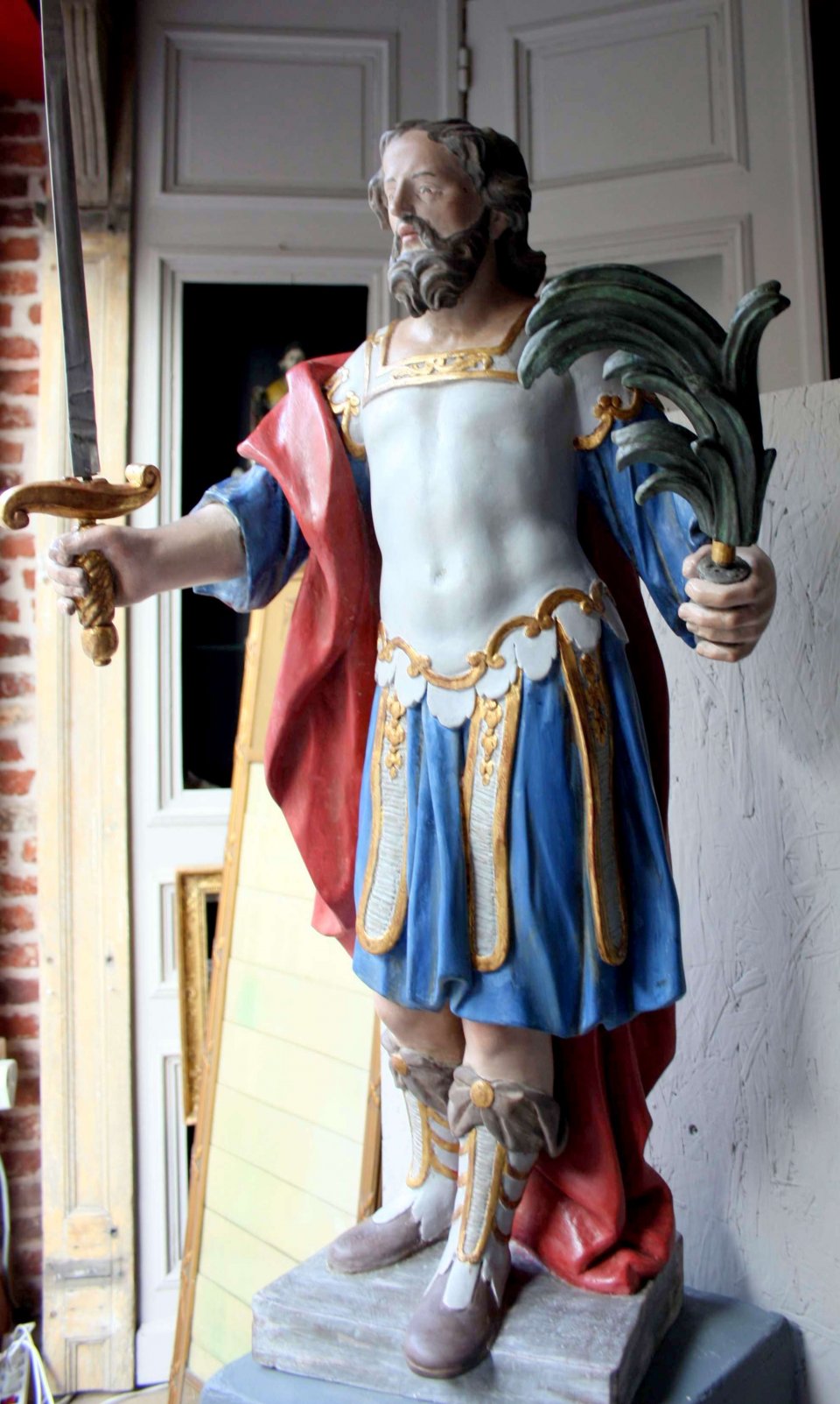 Statue en bois doré et polychrome milieu XIXe ayant subi une importante infestation d'insectes xylophages toujours actifs.Entièrement repeinte, elle a nécessité un dégagement des couches d'origine sous jacentes partiellement existantes, dont son magnifique manteau et une partie des carnations. Traitement du bois, comblement des zones lacunaires, reprise de polychromie et de dorure. Patine des restaurations pour une bonne intégration.