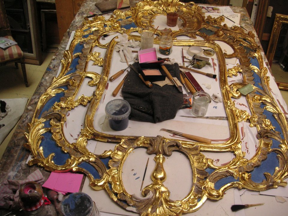 Miroir d'époque Régence en bois doré. Après la restauration, la pose de l'assiette rouge puis pose des feuilles d'or à la détrempe avant le travail de patine afin de vieillir la dorure.